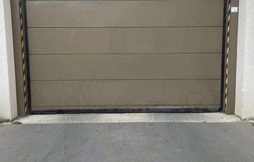 Portail à l'entrée du parking et emplacement sécurisé avec caméra.